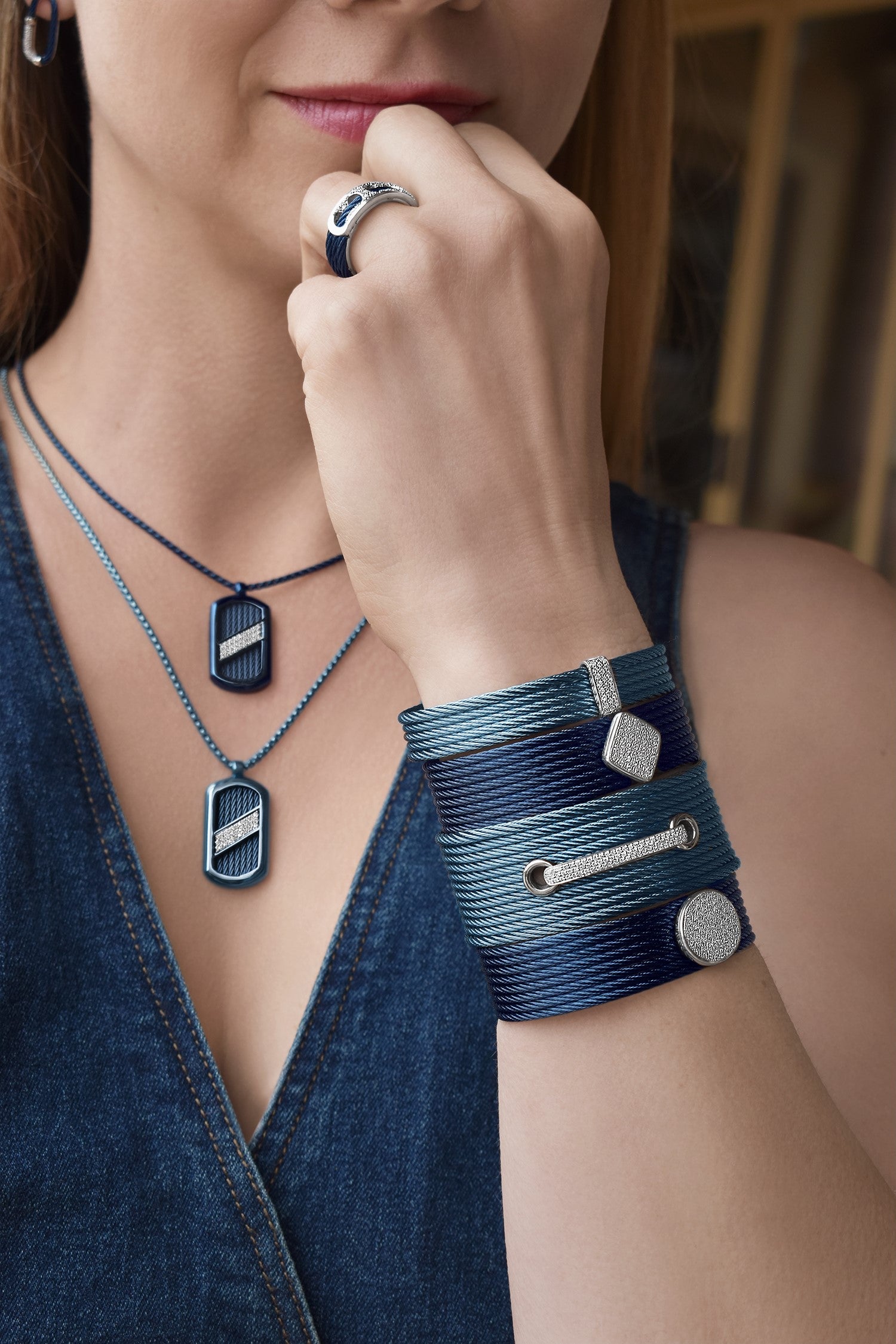 Cuff bracelets stay on by their design, which typically features an opening that allows the bracelet to slide over the wrist and onto the forearm. ALOR's cuffs are also designed in an oval shape that mimics the natural shape of the wrist for comfort and security. Once the bracelet is positioned on the wrist, it's held in place by the iconic stainless steel cables that are designed with enough flexibility to slide onto the wrist, but enough durability to hold their shape. The cuff bracelet should fit snugly around the wrist without being too tight, allowing for comfort and some movement.